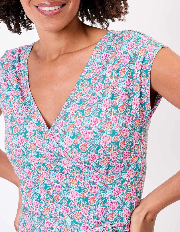 PRINCESSE NOMADE jurk met faux cache-cœur print, gemaakt van LENZING™ ECOVERO™-breisel, elegant en vrouwelijk met subtiele details. Dit kledingstuk is perfect voor alle gelegenheden, zeer comfortabel om te dragen en accentueert het silhouet zonder het te benadrukken.