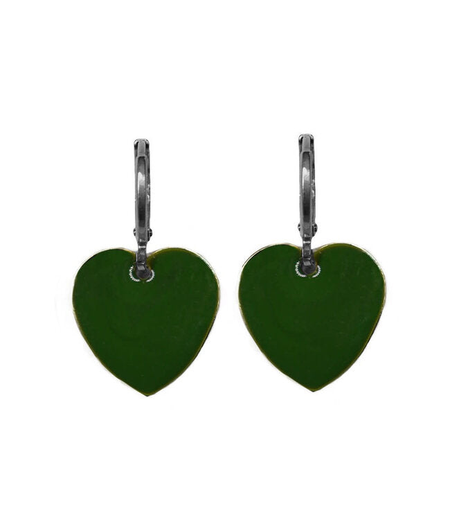Deze metalen hartjes, met aan beide kanten emaille.Hebben een mooi glansje. De oorhaakjes zijn van verzilverd messing