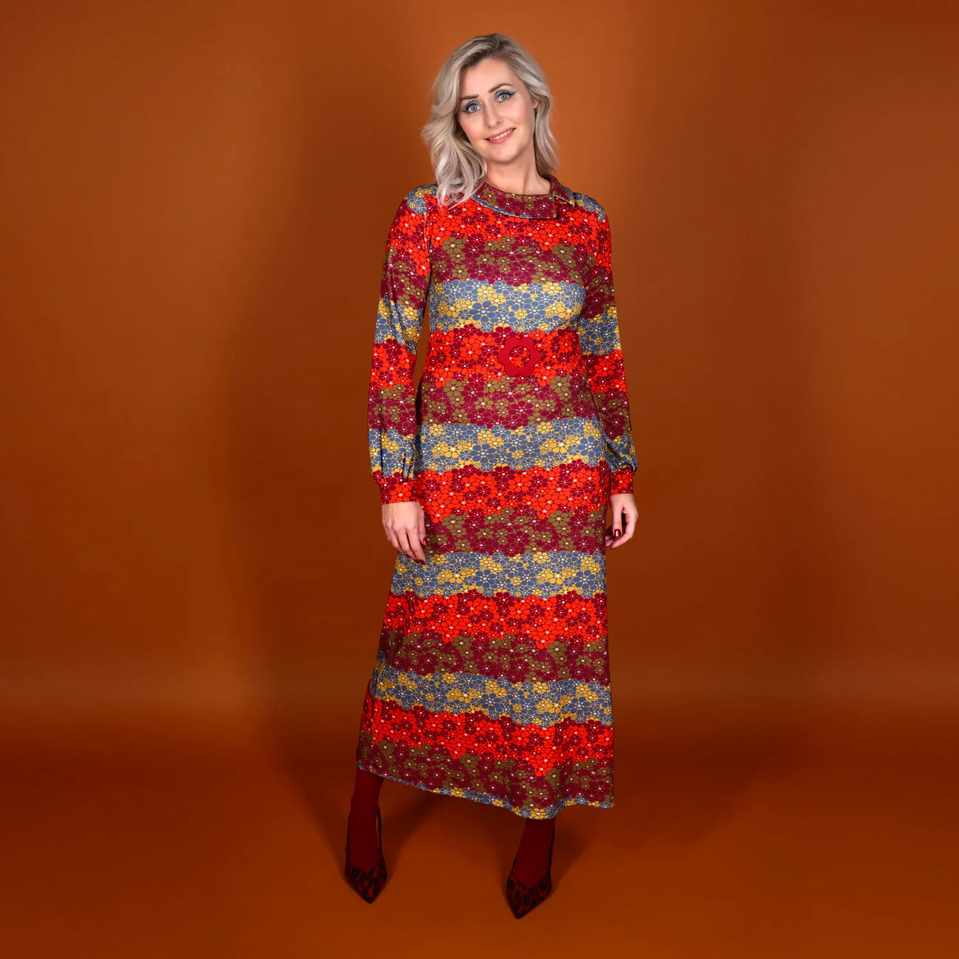 Deze maxi-jurk is een van onze favorieten voor elke feestelijke gelegenheid. In deze versie is hij verkrijgbaar in een kleurencombinatie van wijnrood, legergroen, blauw en beigegoud op een bloemenprint met strepen. De jurk heeft een col, lange mouwen met kleine pofmouwen en manchetten. Hij is in de taille getailleerd door een ‘riem’ met een wijnrode bloemengespen.