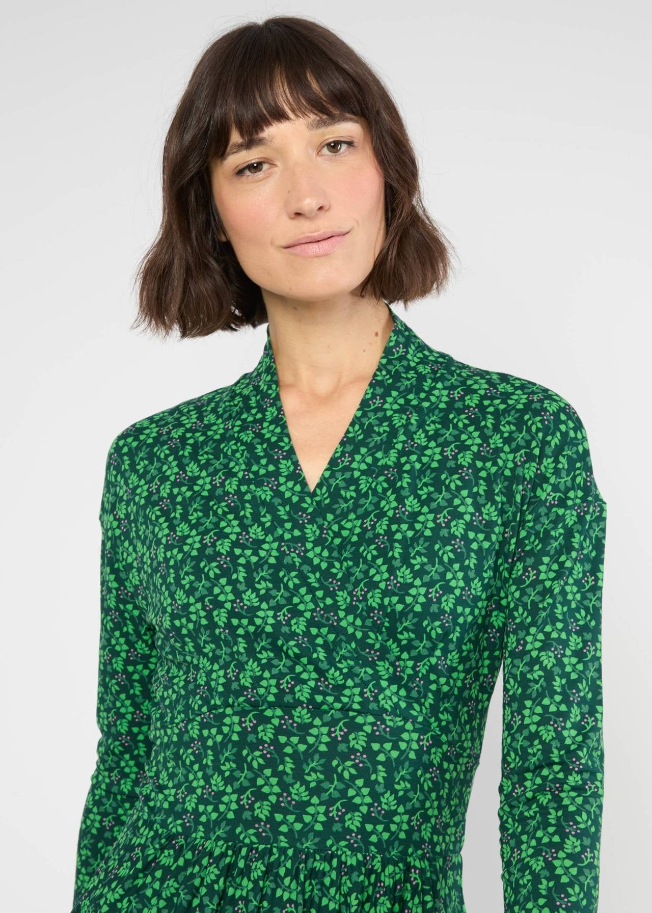 Jurk is gemaakt van zachte viscose-jersey, met sjaal kraag. Zwierig rok silhouet.
