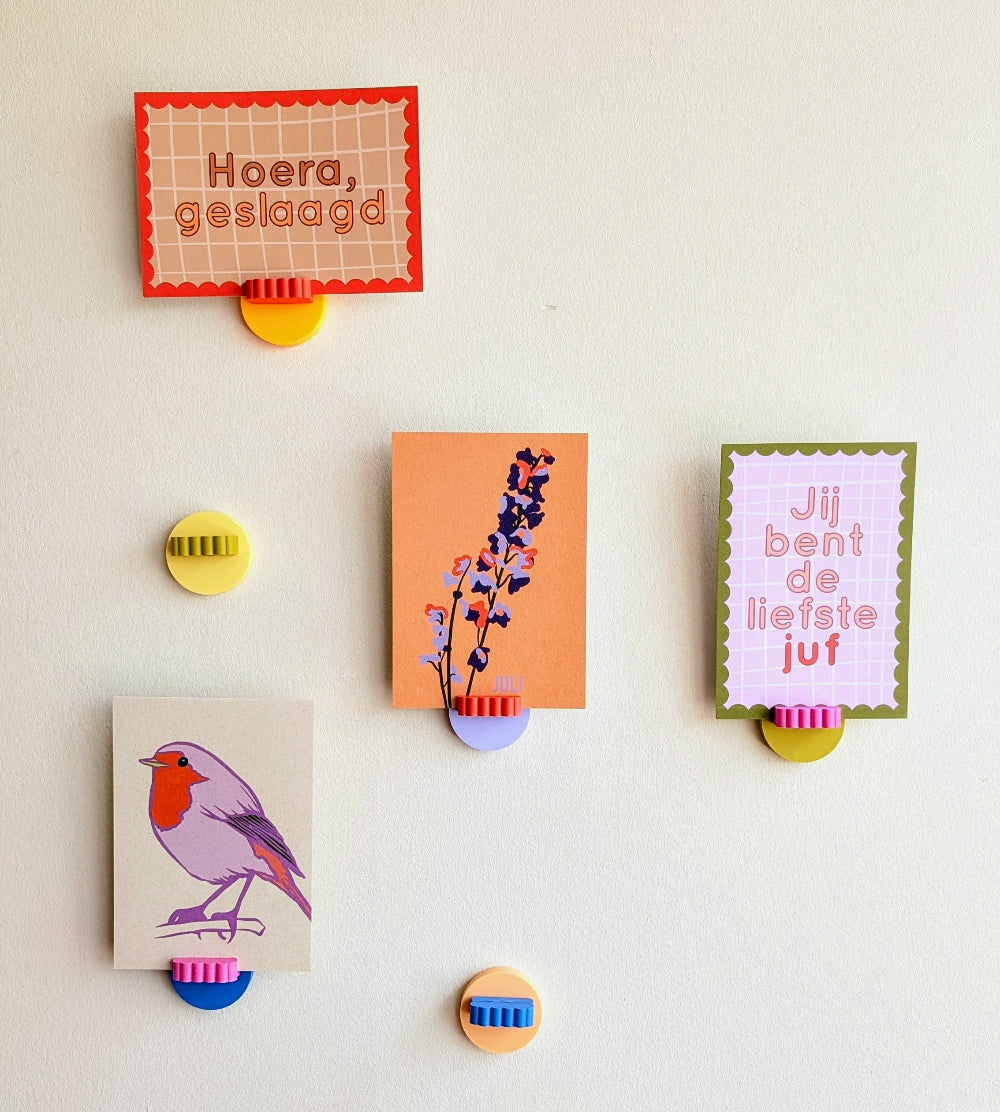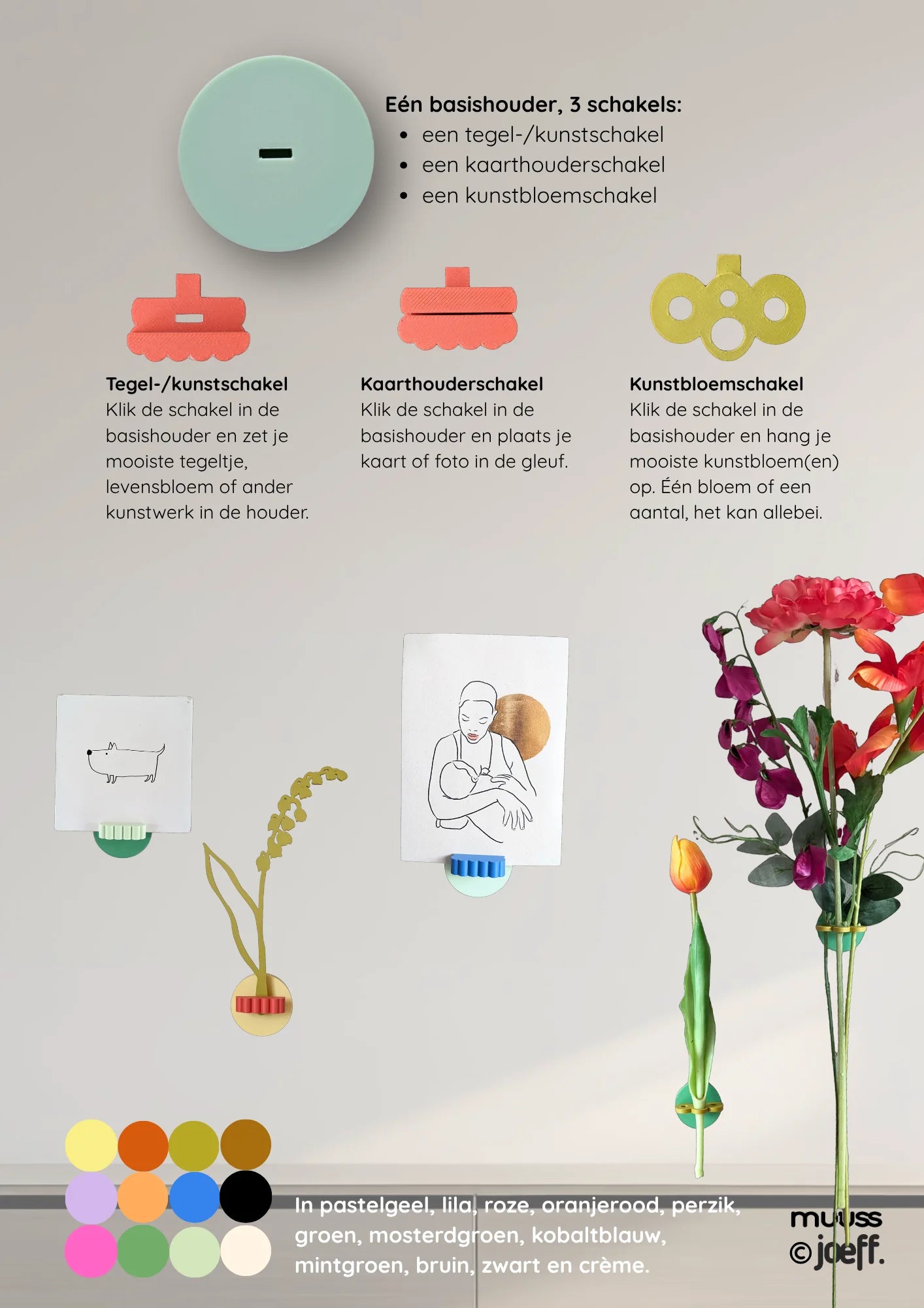 De MUUSS kaarthouderschakel is één van de losse elementen binnen het modulaire MUUSS-systeem. In combinatie met de basishouder creëer je eenvoudig een unieke wandpresentatie voor kaarten, prints, foto's of kleine kunstwerkjes. Zonder te boren.