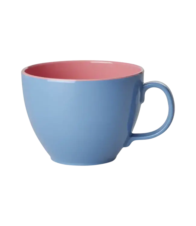 Onze melamine beker in een mooie blauwe kleur aan de buitenkant en een prachtige roze kleur aan de binnenkant. Perfect voor een kopje thee of een warme chocolademelk voor de open haard met een lekker knus dekentje. Houd er rekening mee dat dit product niet geschikt is voor de magnetron.