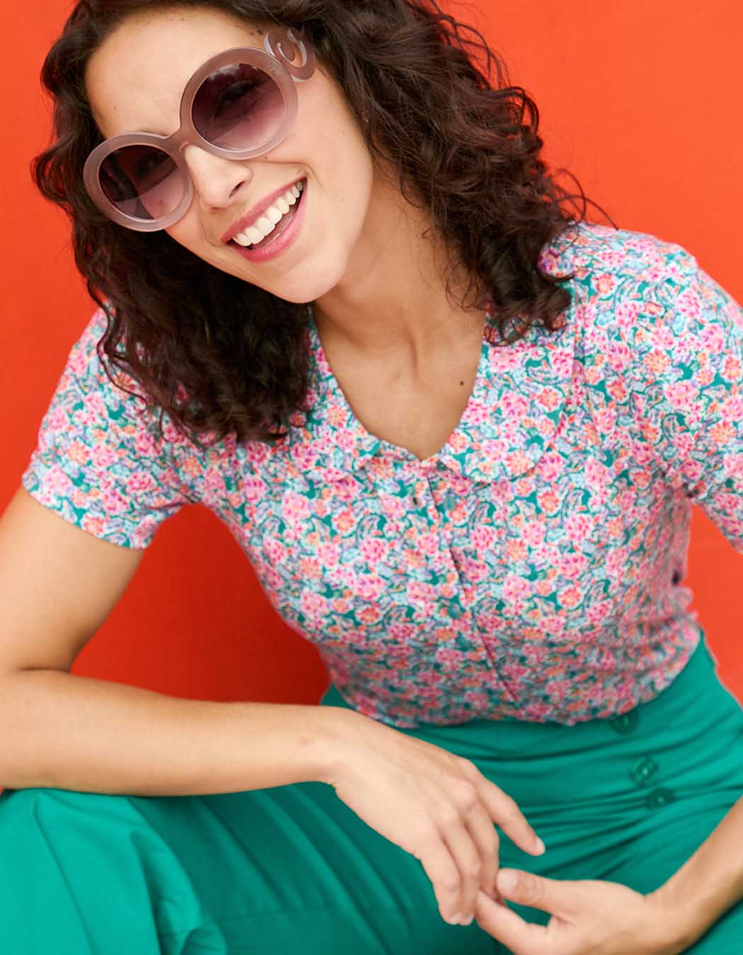 Bedrukte blouse PRINCESSE NOMADE, ideaal om een vrolijke retro-touch aan uw outfit te geven. Met zijn getailleerde snit en Claudine-kraag combineert dit bedrukte hemdje comfort en originaliteit in zijn zachte LENZING™ ECOVERO™-breisel.