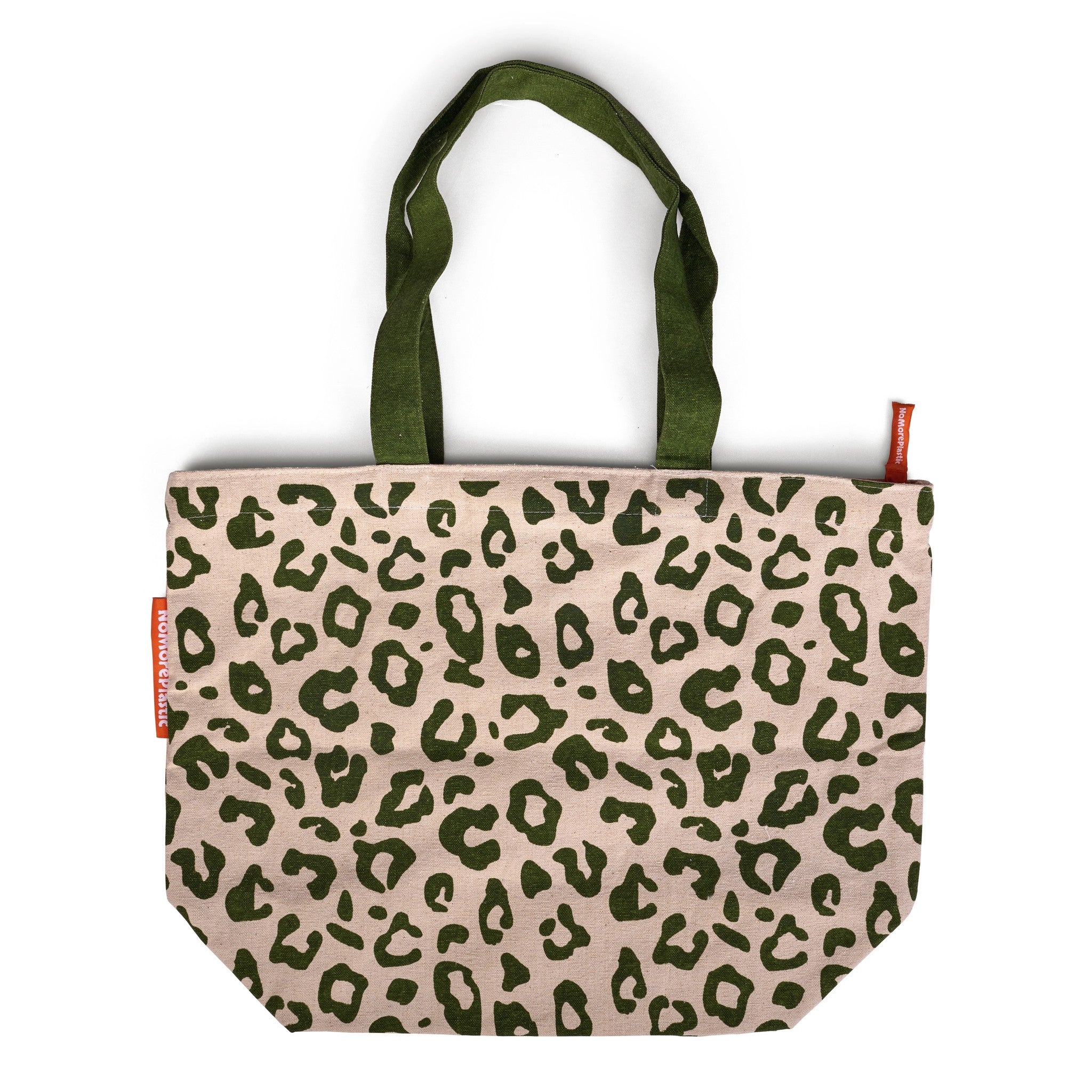 Duurzame shopper van gerecycled bedlinnen en tafellakens in luipaard print.