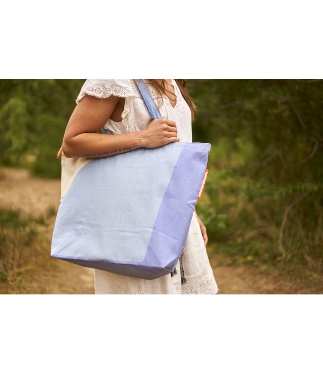 Duurzame shopper van gerecycled bedlinnen en tafellakens Lekker groot formaat: 54x40x18 cm Binnenvoering, binnenvak en ritsen 5% van de opbrengst gaat naar The Great Bubble Barrier