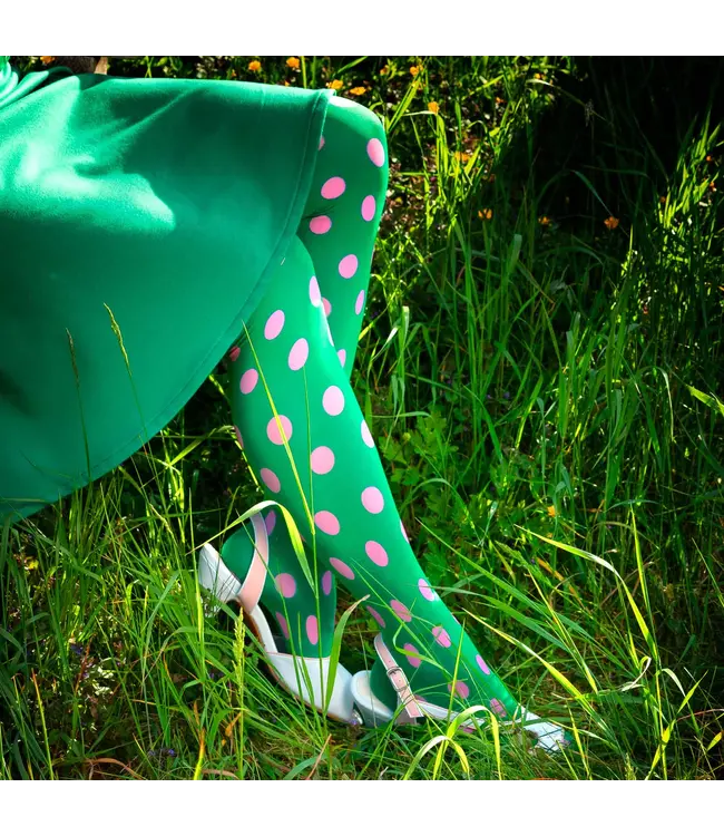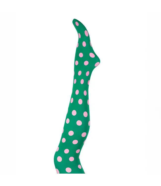 Groene panty met roze stippen.