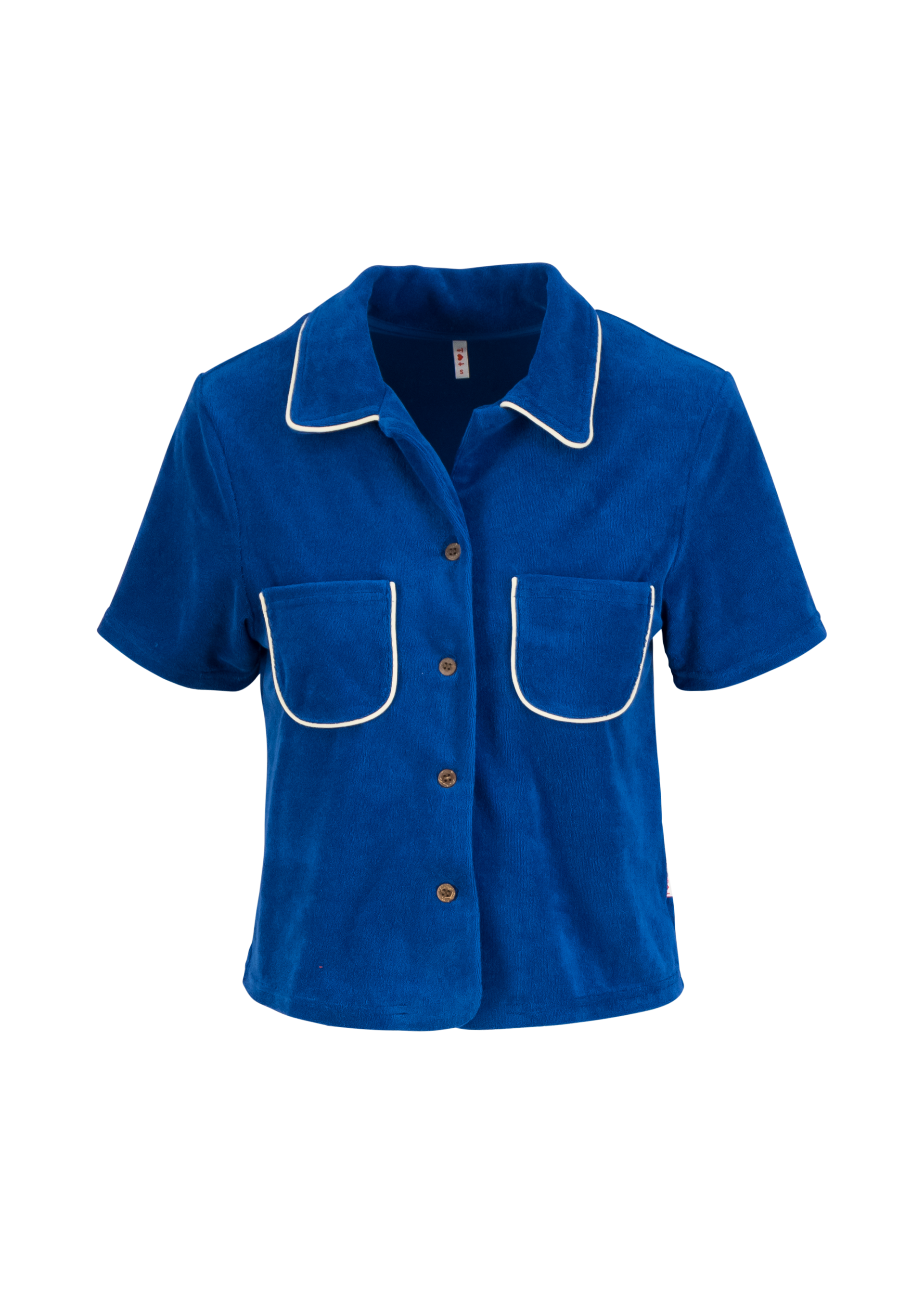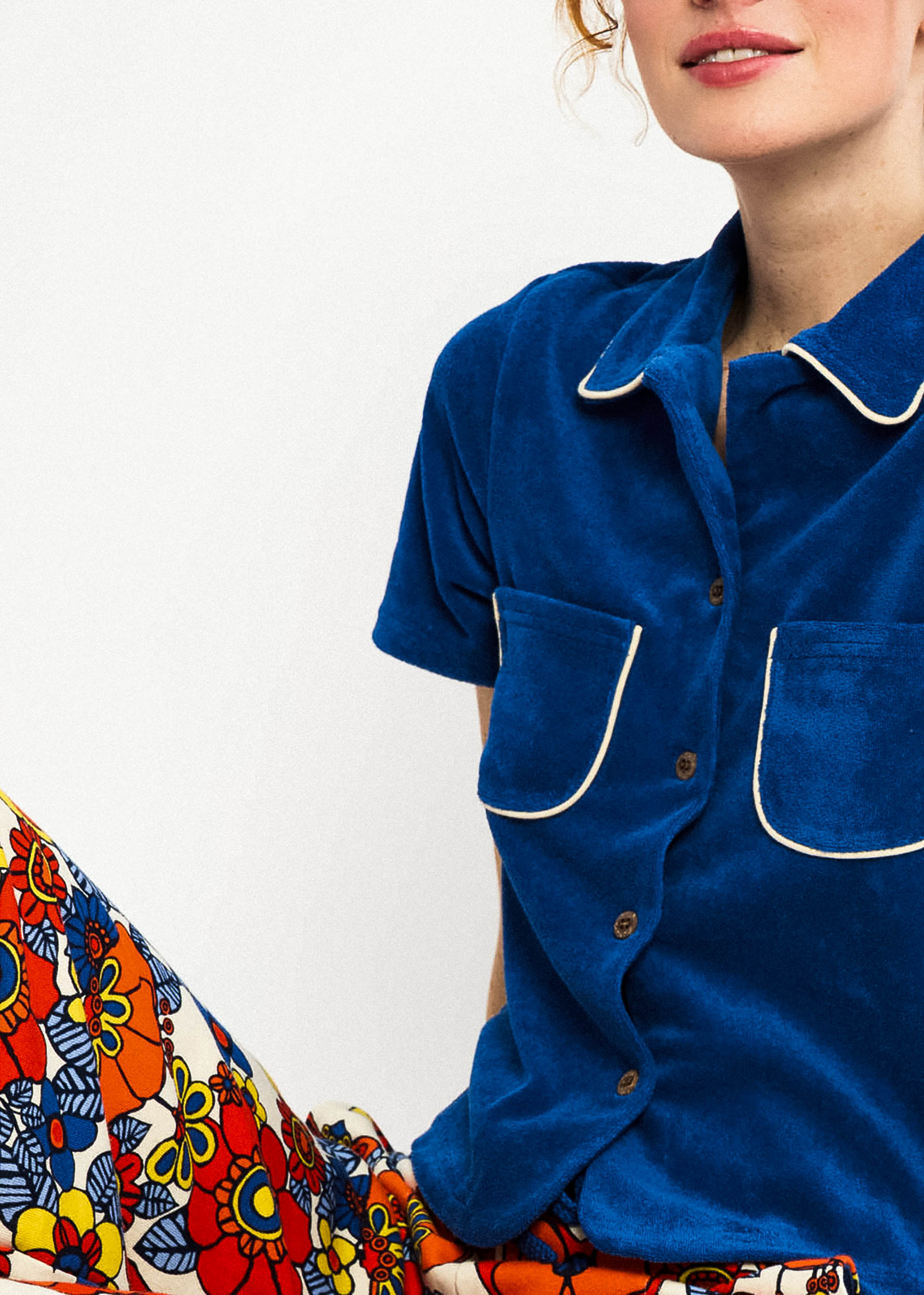 Dit leuke badstof katoenen truitje heeft leuke witte afwerking op de zakjes en in de kraag.