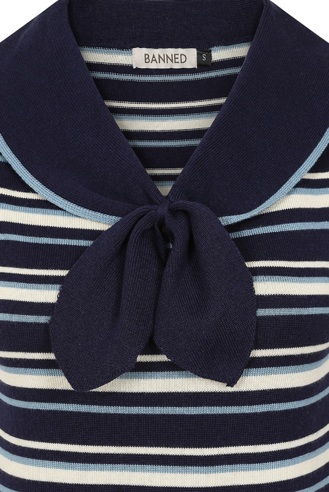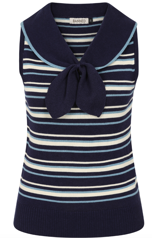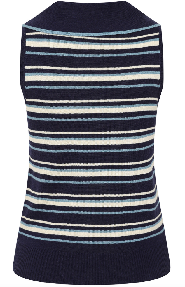 Een hele leuke mouwloze trui. In blauw wit streep.